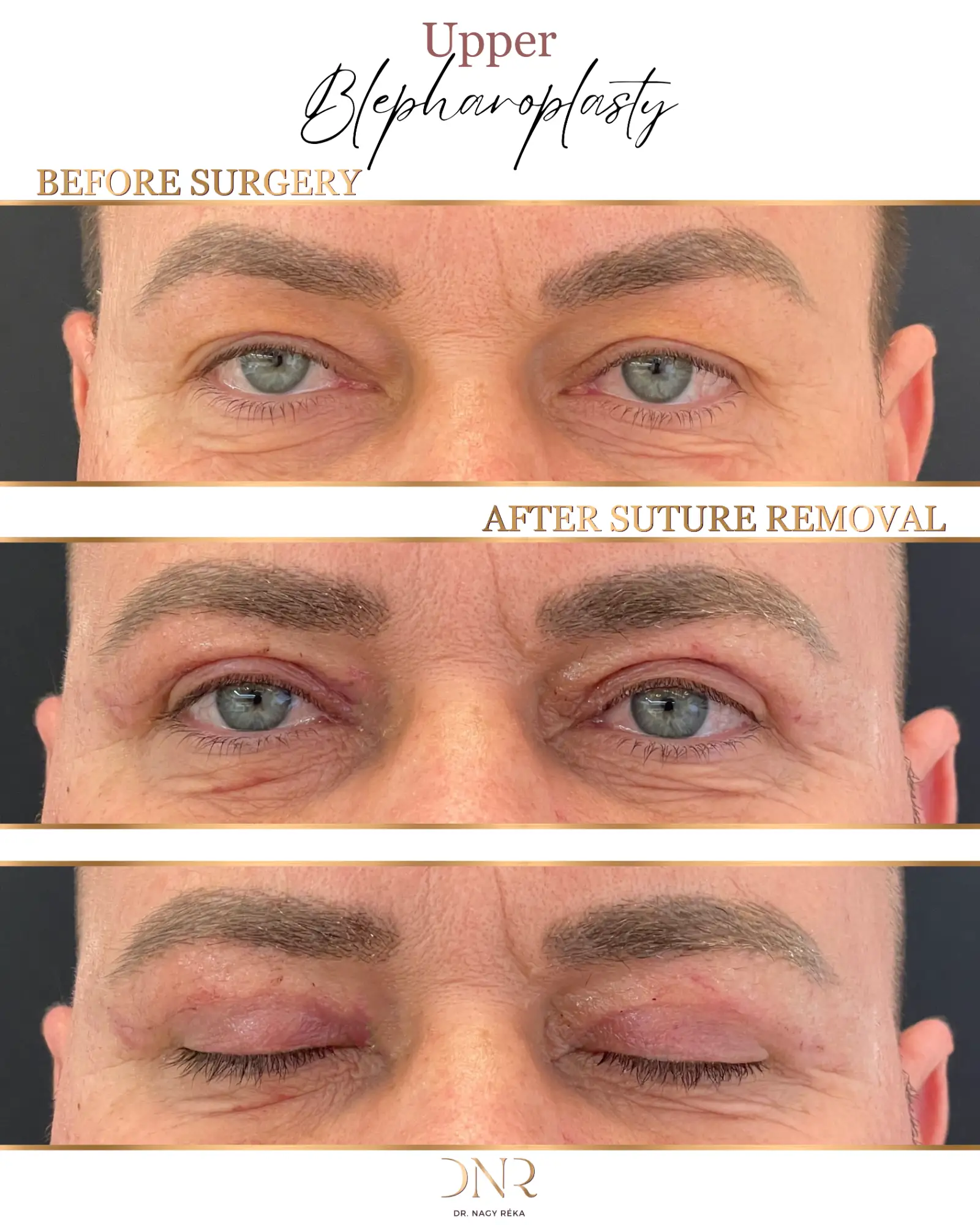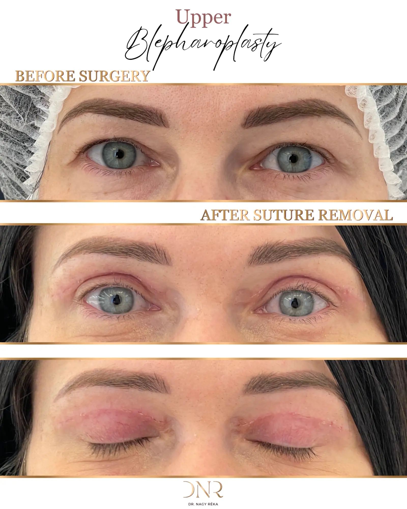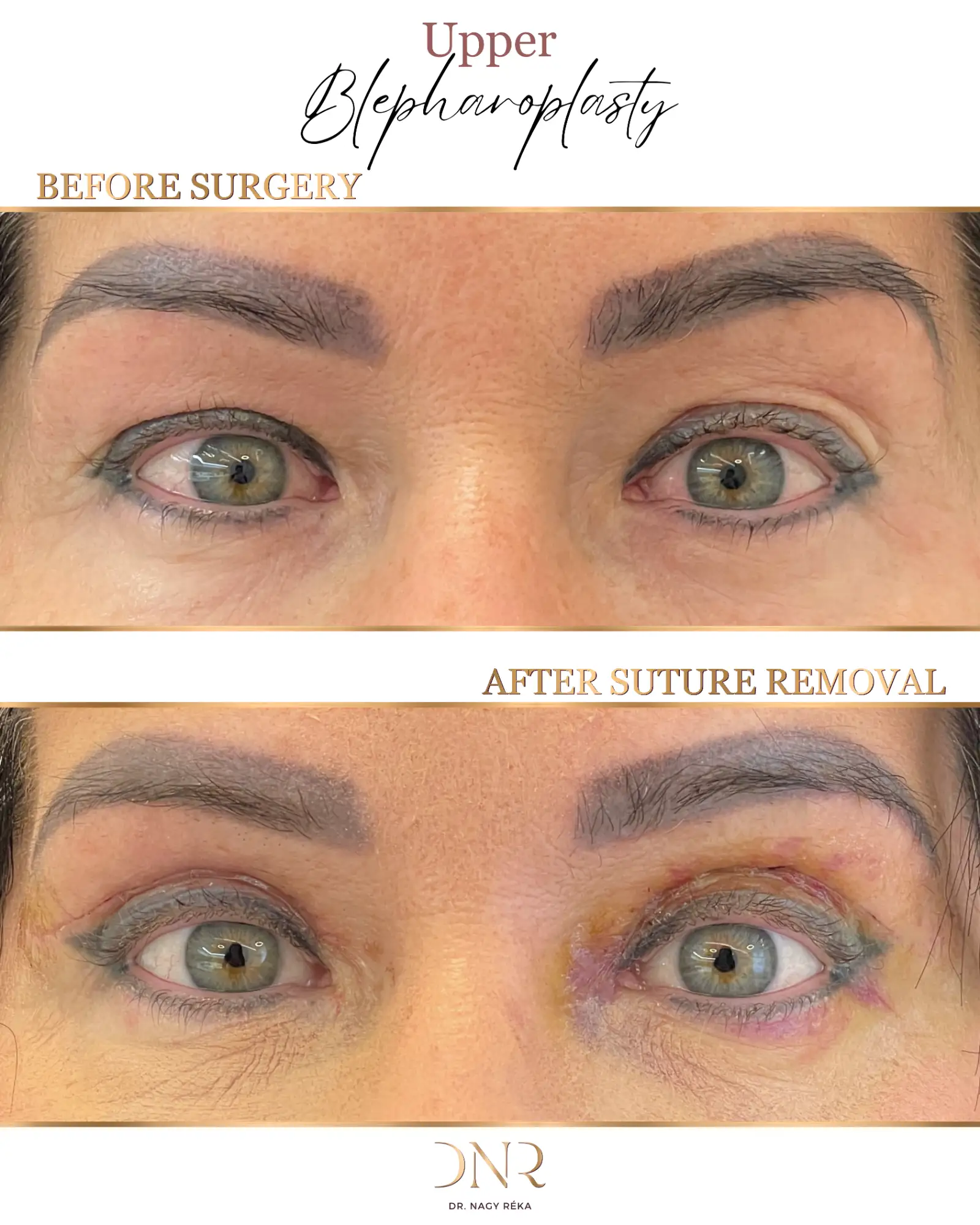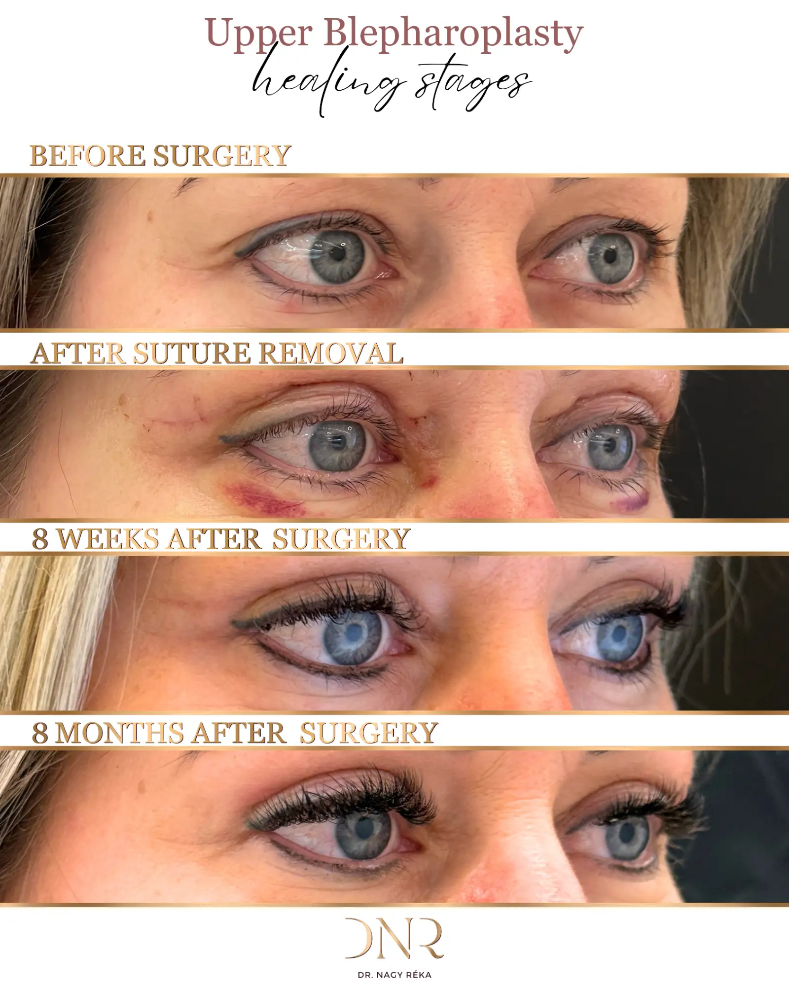 Stitches are typically removed between days 7–14, and the full healing period for upper eyelid surgery is generally 6–8 weeks.